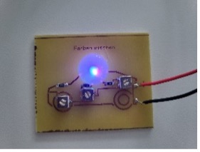 Die Schüler/innen strukturieren fotolithographisch eine Leiterplatte, bestücken diese mit SMD-Bauteilen (Dioden, Widerstände, Schalter) und löten. Sie schneiden mit einem Lasercutter für die Schaltung ein geeignetes Design aus und montieren beide Teile.