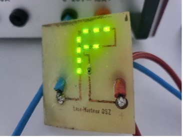 Die Schüler/innen strukturieren fotolithographisch eine Leiterplatte, bestücken diese mit SMD-Bauteilen (Dioden, Widerstände) und löten diese mit dem Ziel, einen selbstleuchtenden Gegenstand in Form eines „F“´s für Optikversuche herzustellen.